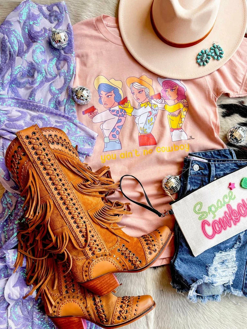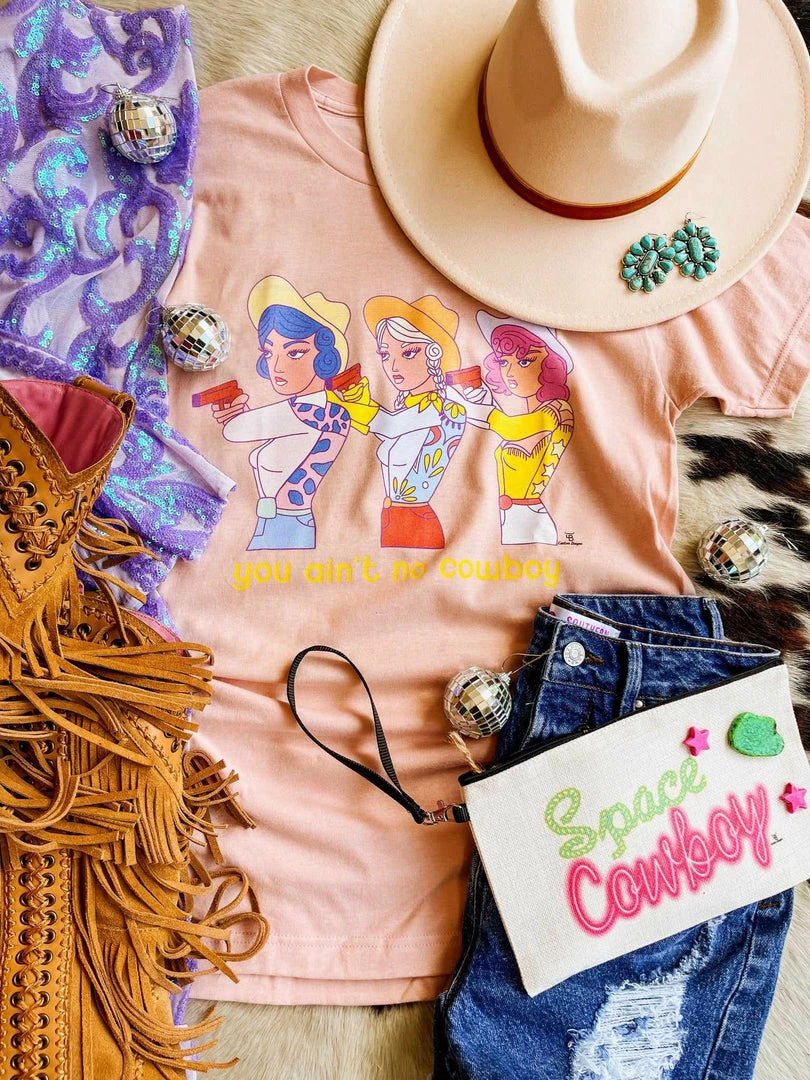 You Ain’t No Cowboy Tee. Printed on a sand dune colored tee. Unisex fit. Custom-made just for you!