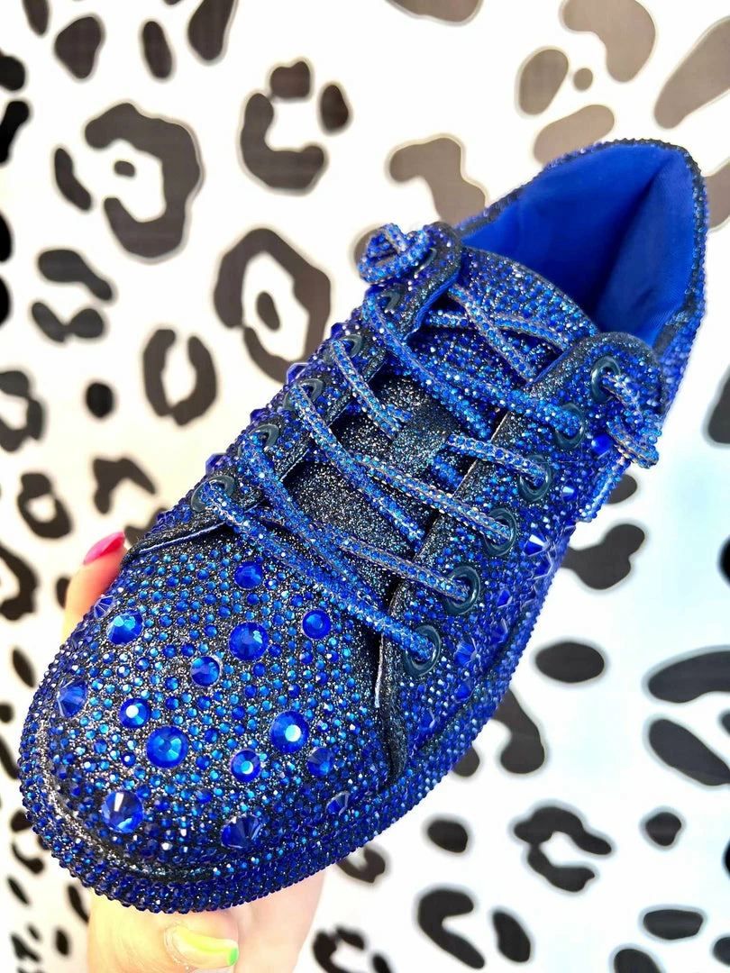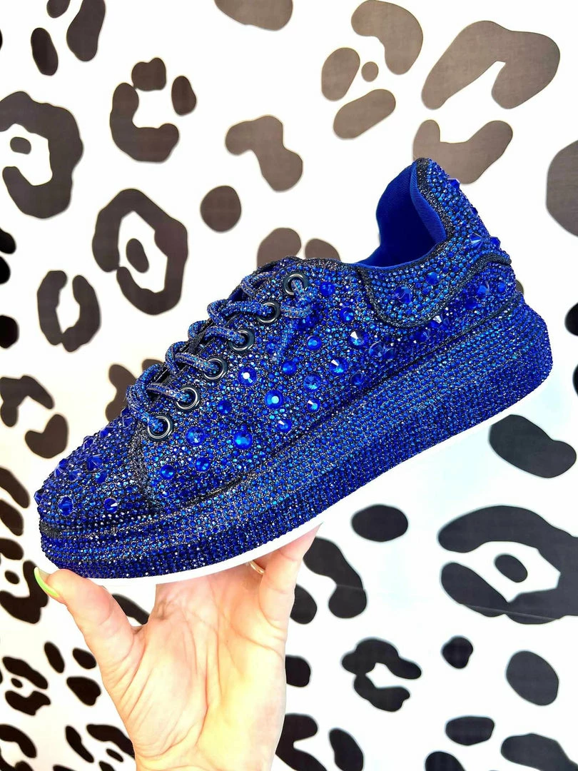 The Azela Wang “Glittery Midnight Chic” Flat Sneaker in Blue is a total show stopper! These glitter sneakers are perfect for adding some pizzaz to casual outfits! Complete with a rounded toe and low cut collar. Perfect Fourth of July accessory for the patriotic chic!