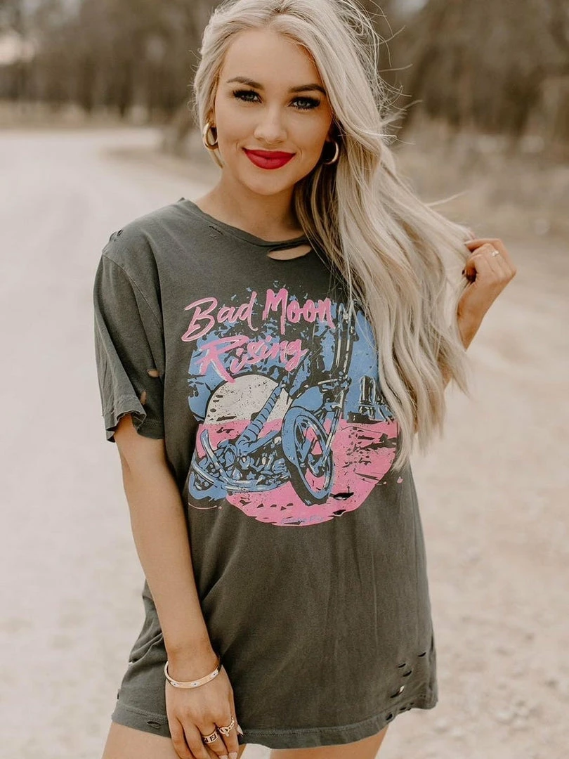 Calling all bad chics! This is the tee! This faded black tee features a a chopper and the bright pink just makes this tee stand out! Perfect for a day riding motorcycles!