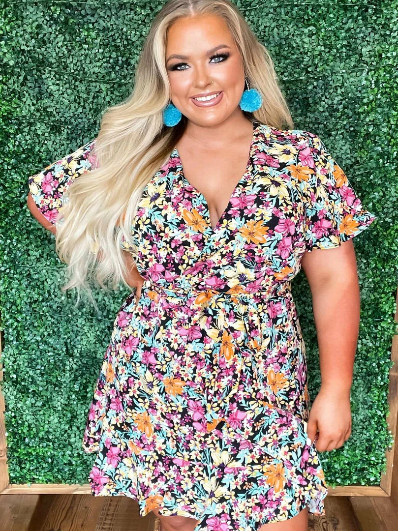 Your go-to floral dress for summer! This wrap dress has a black base with beautiful pink, yellow and blue floral print throughout. The wrap top and flowy sleeves are figure flattering for every size! Back zipper.