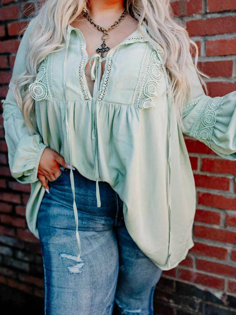 Put some sage on your style and wear theΒ Circle Of Love Top,Β in sage color!Β This flowy and comfortable top is the perfect top for all season. It has the perfect coverage while letting you feel cool at the same time! Pair it with your favorite shorts for a clean and sleek look! Check out the crochet detailing that ties if you want more coverage and has elastic around the wrists.