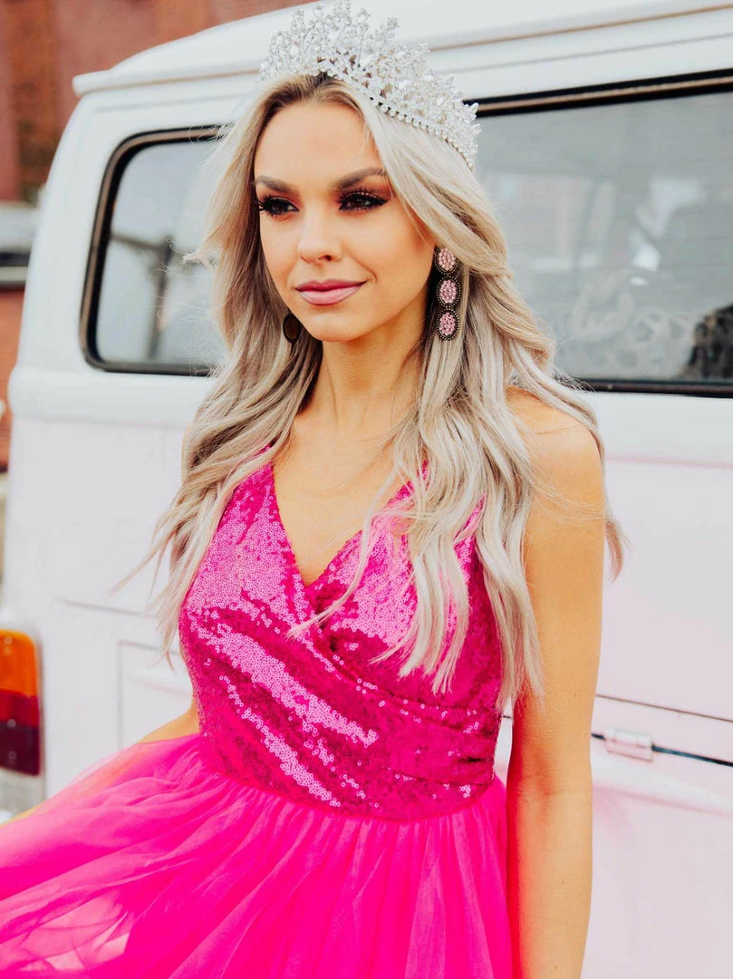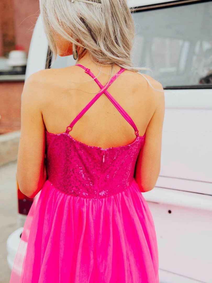 Own the moment in the Playing Dress Up full length sequin and tulle dress featuring adjustable spaghetti straps and zipper back. It’s the perfect look for your next formal event.ย