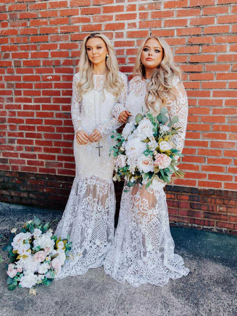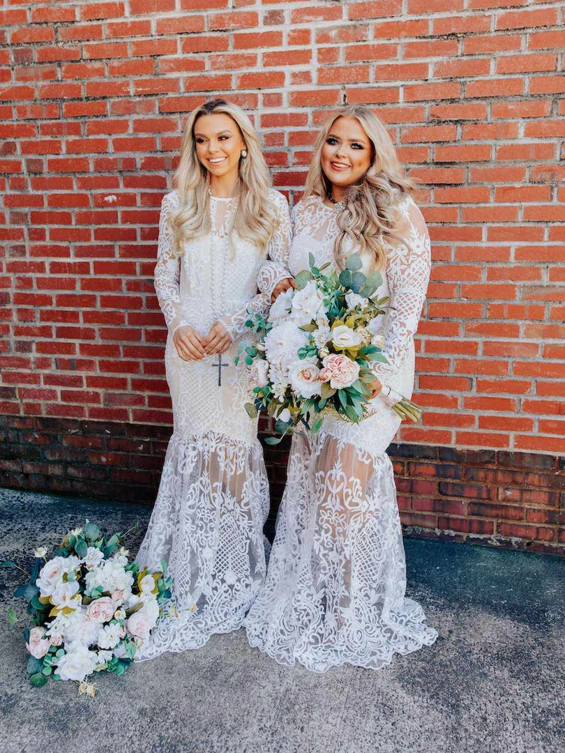 Just imagine how stunning you are going to look walking down the aisle in the World Stands Still dress featuring sheer long sleeves, a lace applique tulle illusion skirt, and a plunging open back.ย