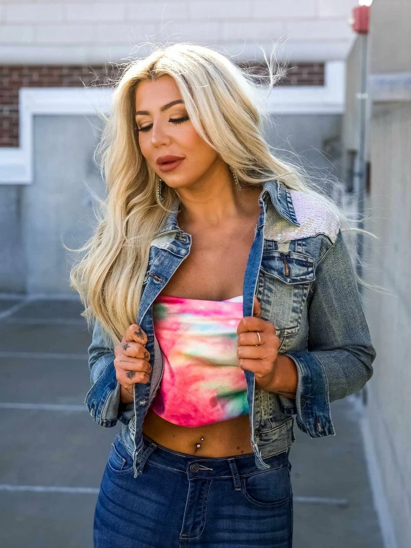 WOW! The “Jean Jacket” is available in SEQUINS with the softest denim! This jacket has STRETCH and is a cropped fit. Perfect for any body type. Part of the Chics Collection and Curvy Chic Certified with sizes XS-3XL! Designed by our owner Liz. Manufactured by Southern Fried Chics.