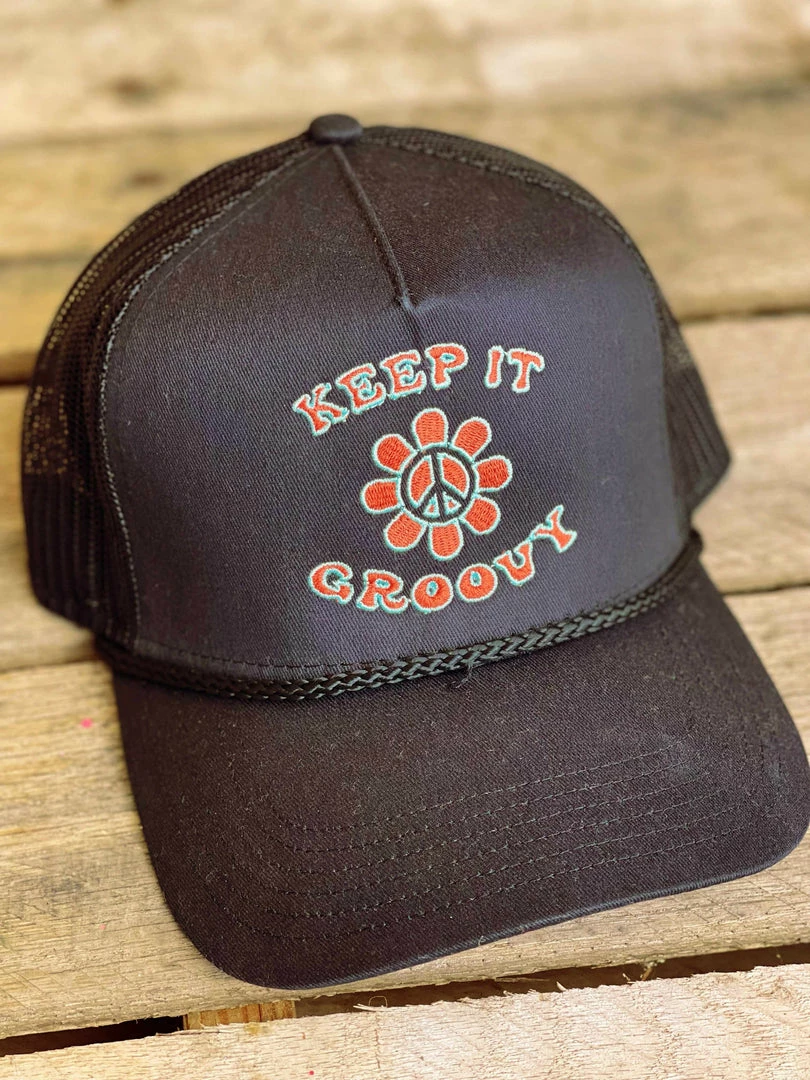 Keep It Groovy Hat features a fun flower and peace sign.Ā Pair this with your favorite graphic tee, cutoff denim shorts, and Western Boots! This hat is great for those dreadful bad hair days! Black cap with Light Blue and Orange threading.