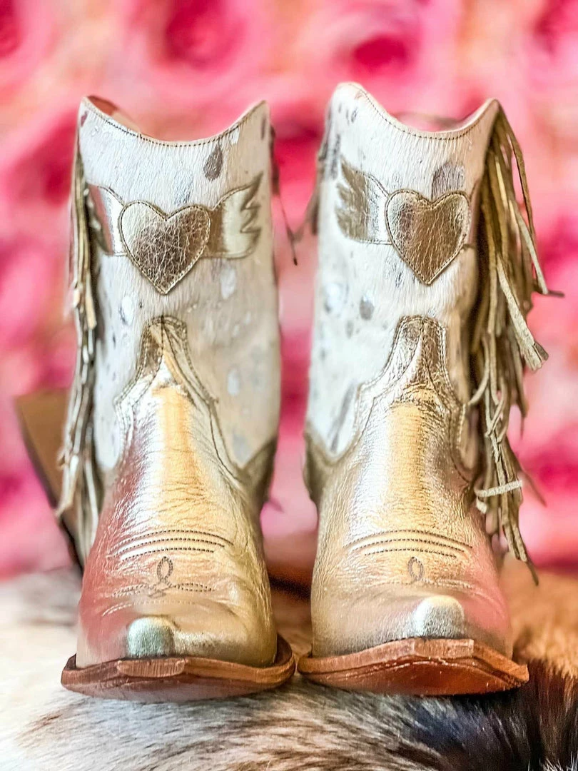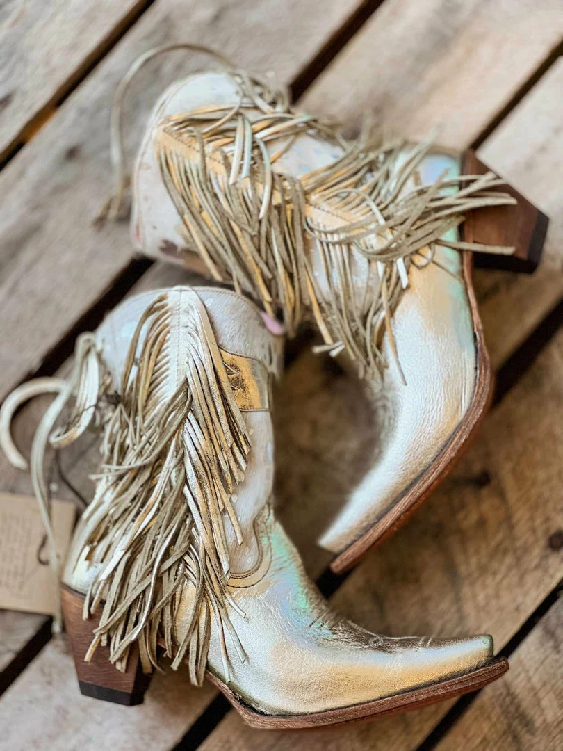 Shortie boots featuring an exclusive acid washed, hair on leather with metallic fringe, contrast inner lining, a side zipper, medium heel, and a stylish snip toe.