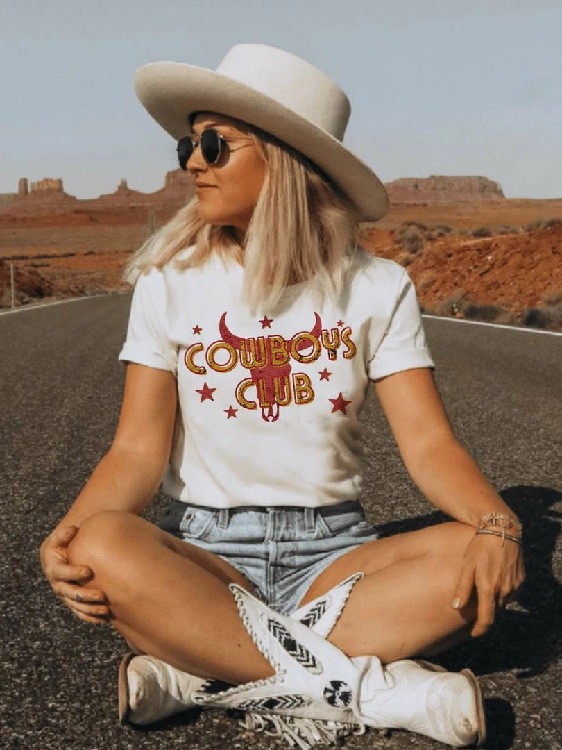 Cowboys Club Tee! This tee is perfect for layering. Easily dressed up or dressed down! Printed on a unisex super-soft tee. White colored tee.