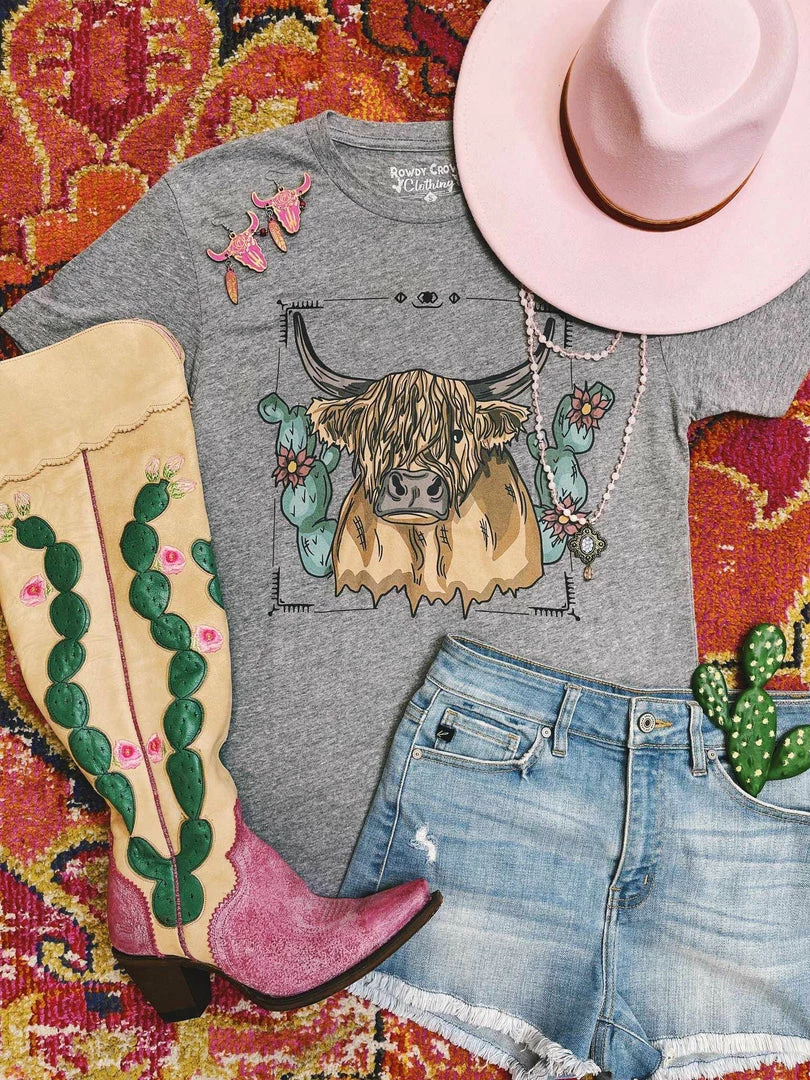 How cute is this little swanky highlander! This lovely tee features the trendy highlander and can’t forget about the cactus! Wear this tee to the next rodeo! Pairs perfectly with denim and western boots!Â