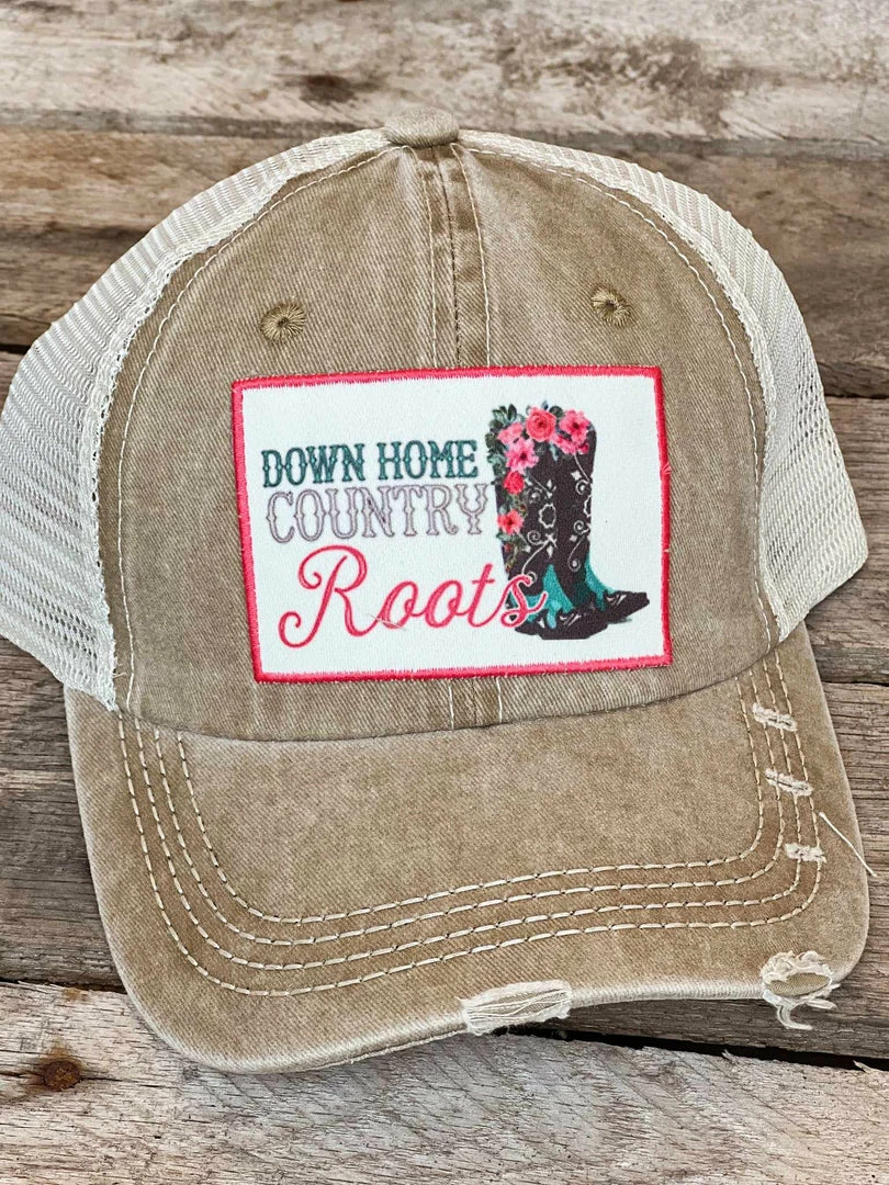 “Down Home Country Roots” Patch Distressed Trucker Hat for Women