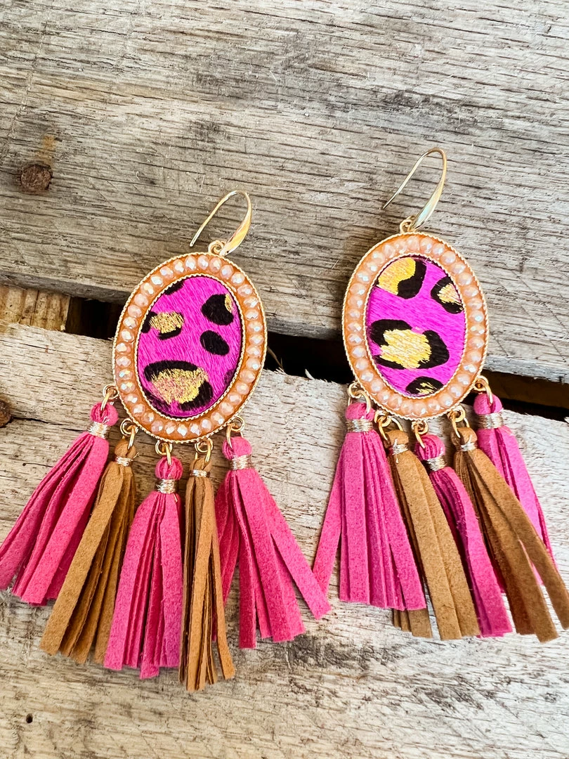 Oval Pink Leopard Tassel Earrings