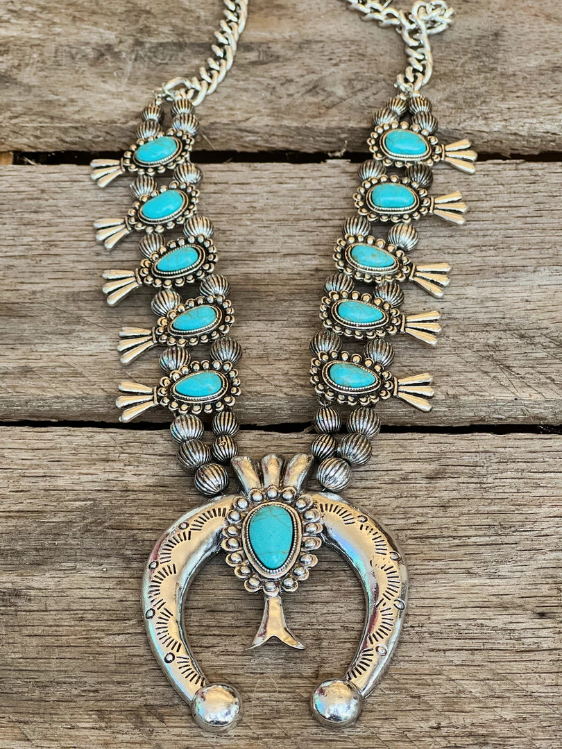 This Turquoise Stone Necklace showcases some serious western style! A silver horseshoe shaped pendant beautiful turquoise throughout, this statement necklace is a cowgirls dream!